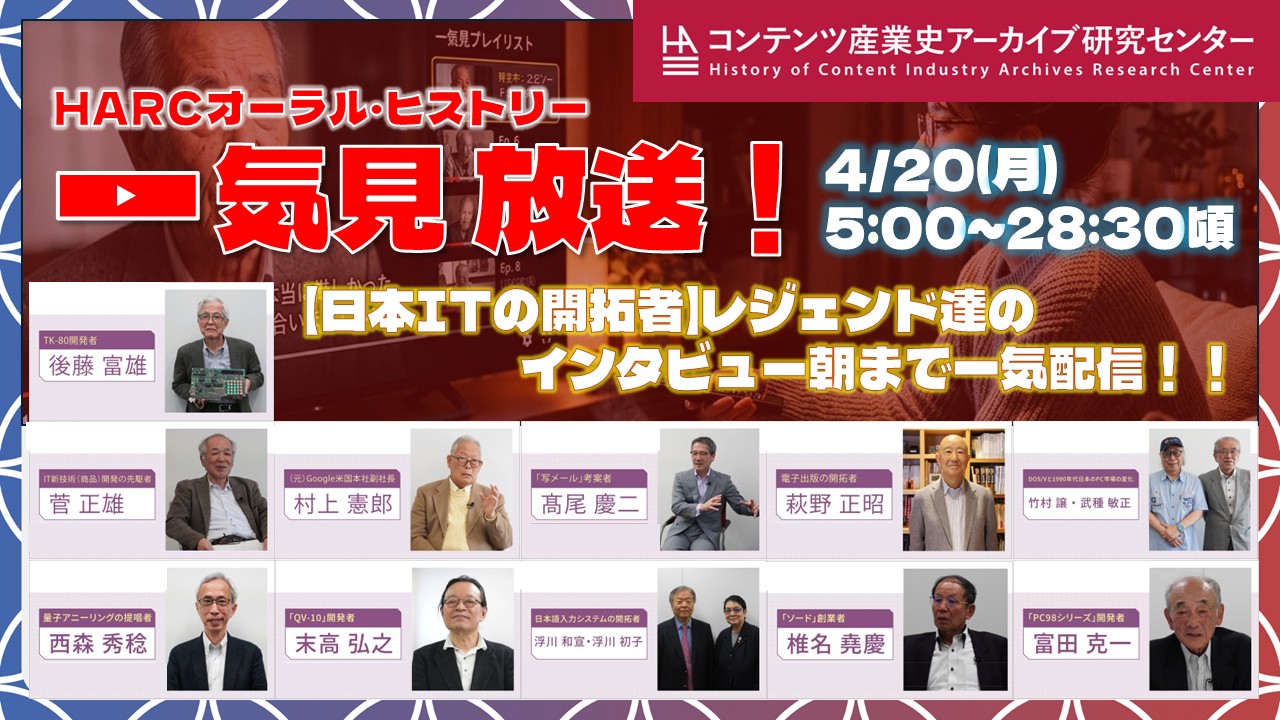 ZEN大学コンテンツ産業史アーカイブ研究センター(以下、HARC)は、日本のコンテンツ産業に関わる各分野で活躍した、業界の第一人者の証言を映像と文字起こし資料で記録した「オーラル・ヒストリー コレクション」を、ZEN大学 大学祭「展軸祭」にて一気見放送をさせていただきます。