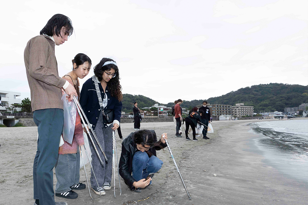 その後、学生たちは逗子キャンパスから徒歩10分ほどの逗子海岸へ移動し、実際にビーチクリーン活動を体験。砂浜に落ちているプラスチック片や木片を丁寧に拾い上げ、「自然物と人工物の区別が意外に難しい」「小さなゴミにも大きな課題がある」といった気づきを共有しました。