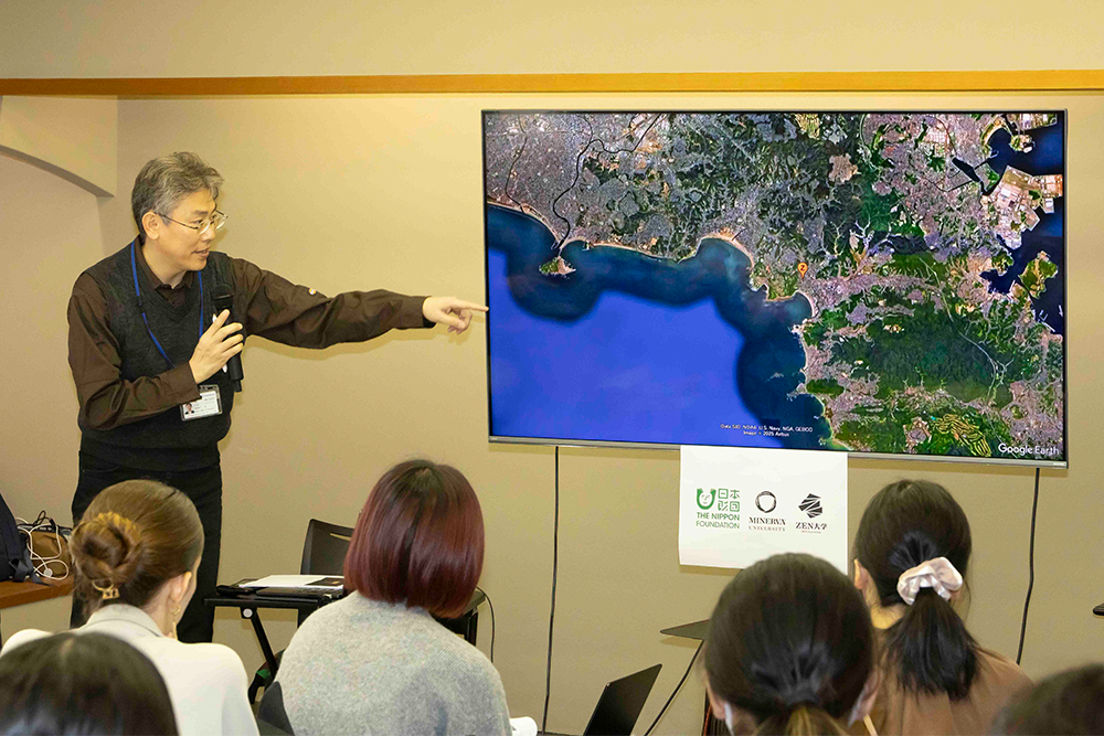午前のセッションでは、笹川平和財団海洋政策研究所 上席研究員の塩入同(しおいり・とも)さんを講師に迎え、「相模湾におけるダムの影響」や「瀬戸内海のごみ問題」など、海洋環境の現状について講義を実施。塩入さんは、「海は国境を越えてつながっており、守るためには世界的な視点が欠かせない。そのためにゴミを出さない工夫やビーチクリーン活動が必要」と語り、学生たちに午後の協働作業のヒントを与えました。