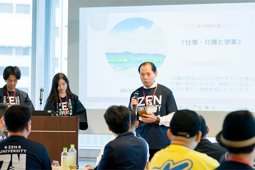 2025年9月27日(土)に開催した「ZEN大学2025年10月新入生懇親会」では、プログラムの一つとして、4月に入学した在学生による「学生ミニ講演」を実施しました。今回は、「仕事・介護と学業」をテーマに話してくれた「akiyuki」さんの講演内容をお伝えします。