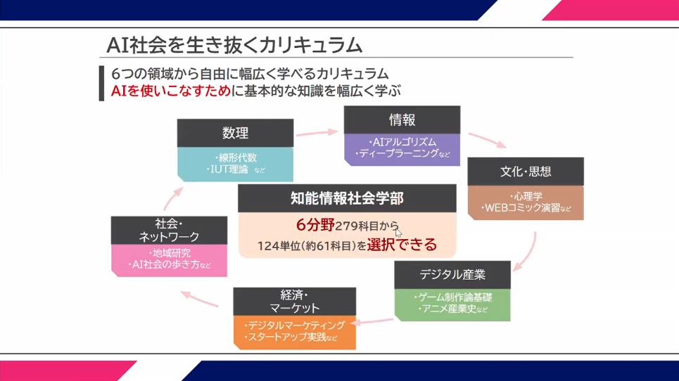 出願初日ガイダンスはZEN大学の説明から始まりました。ZEN大学の学部は、「知能情報社会学部」の一つだけ。ただし、その一つの学部の幅がとても広く、6分野、279科目から興味があるものを選択し、学べるというのです。
