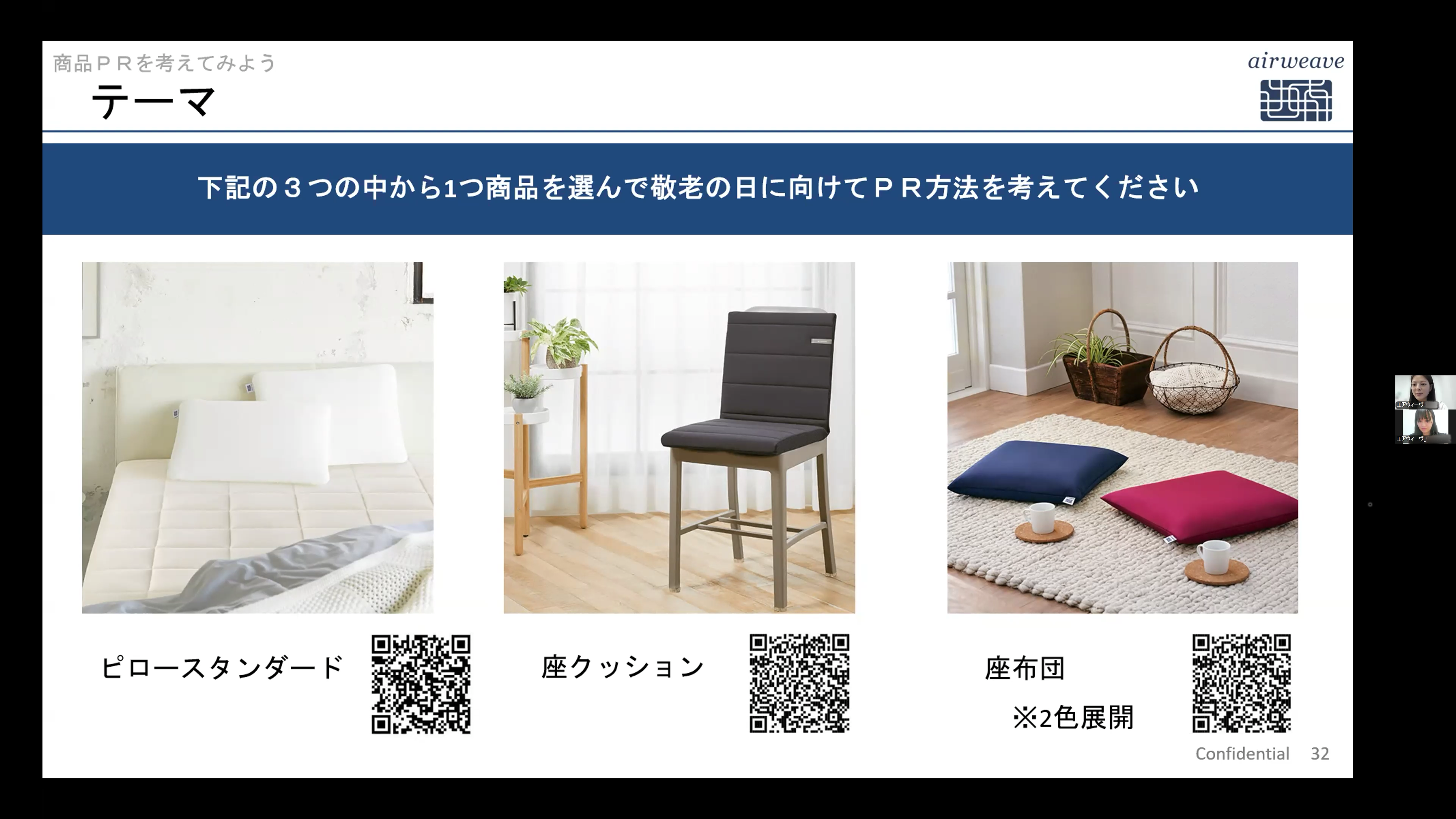 1つはエアウィーヴです。普段から商品を使っていることもあり、企業理念に共感できるのではと思って参加しました。商品のPR方法を考えるワークショップがとても面白く、環境にやさしい素材を使っていることなど、初めて知ることも多く驚きました。