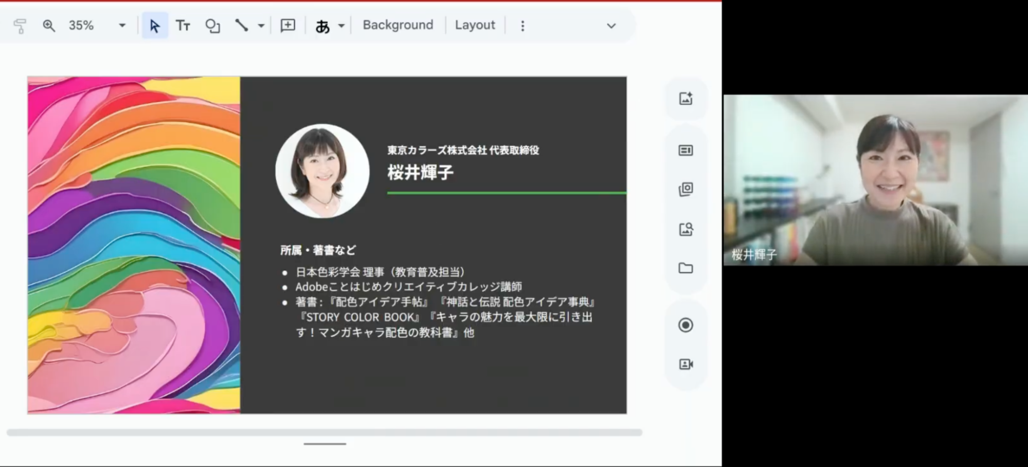 東京カラーズ株式会社の代表取締役で、色彩学の第一人者である桜井輝子先生。「色彩に関することなら何でも」と語る先生は、企業向けアドバイスや書籍制作など幅広く活動されています。本授業は、初心者でも楽しく学べ、すぐに実践に活かせるよう、色彩学の中から「使いやすい部分」を抽出して構成されています。