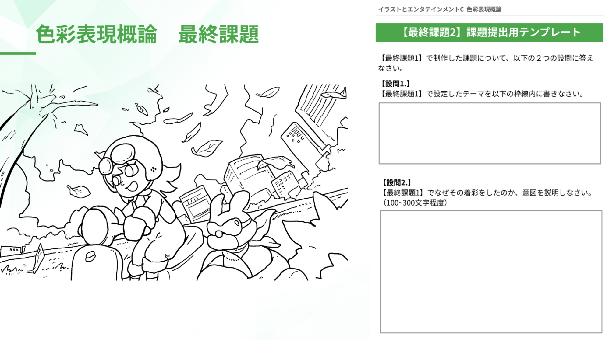最終課題は、指定の線画に色を塗り「なぜその色を選んだか」をコンセプトとして説明することです。