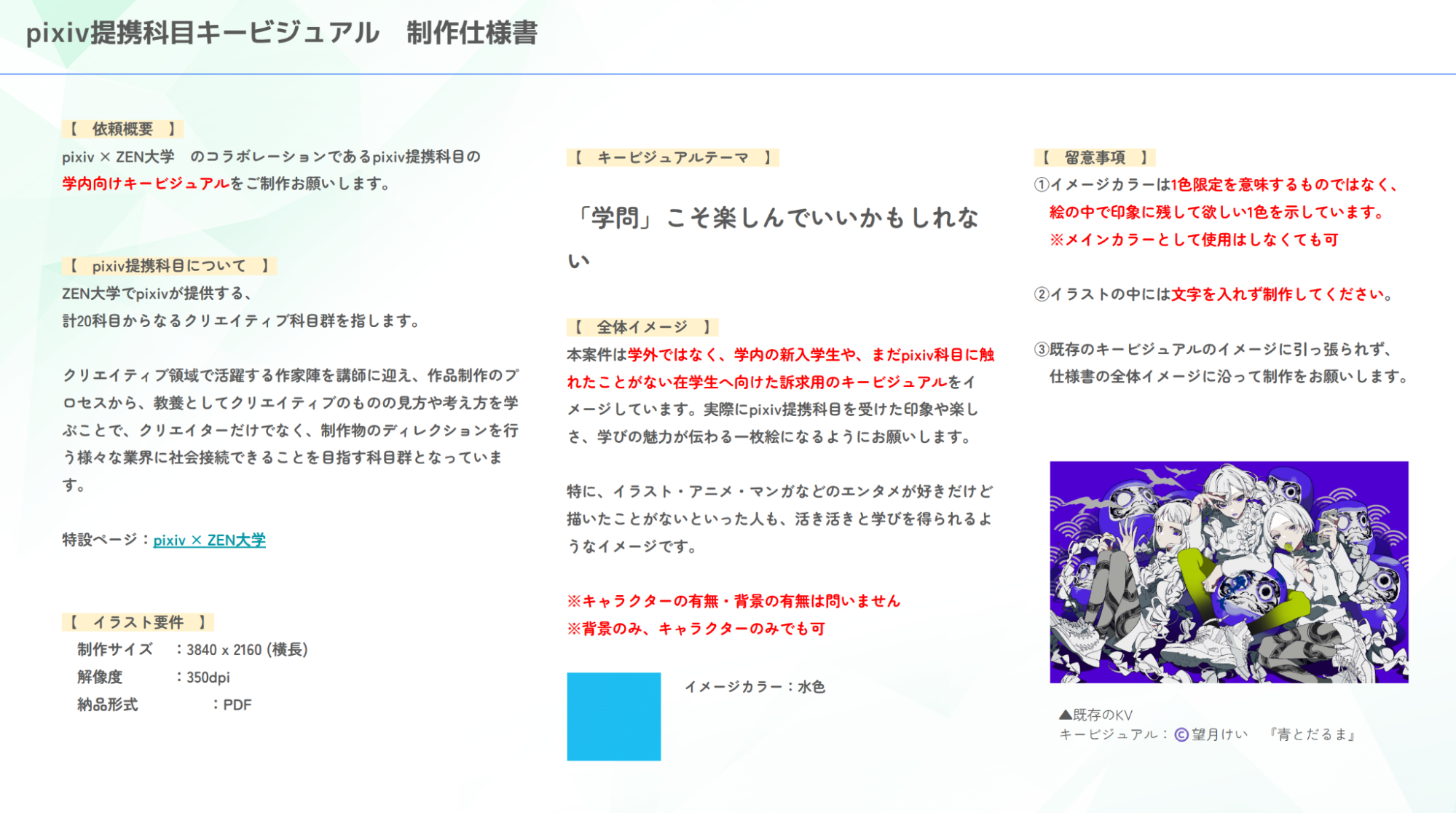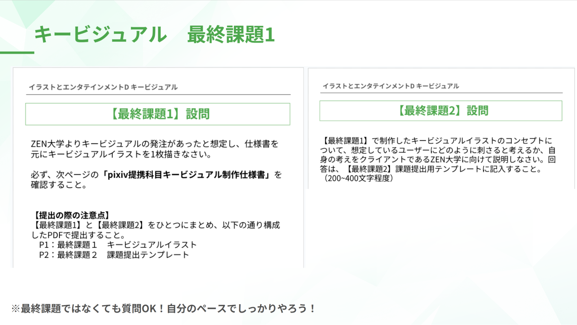 最終課題は、pixiv提携科目を新入生に訴求するためのキービジュアル制作です。キービジュアルはコンテンツの第一印象を決めるため、「人にどう見られるか」「どう見せたいか」を意識し、エンドユーザーに伝える視点が求められます。