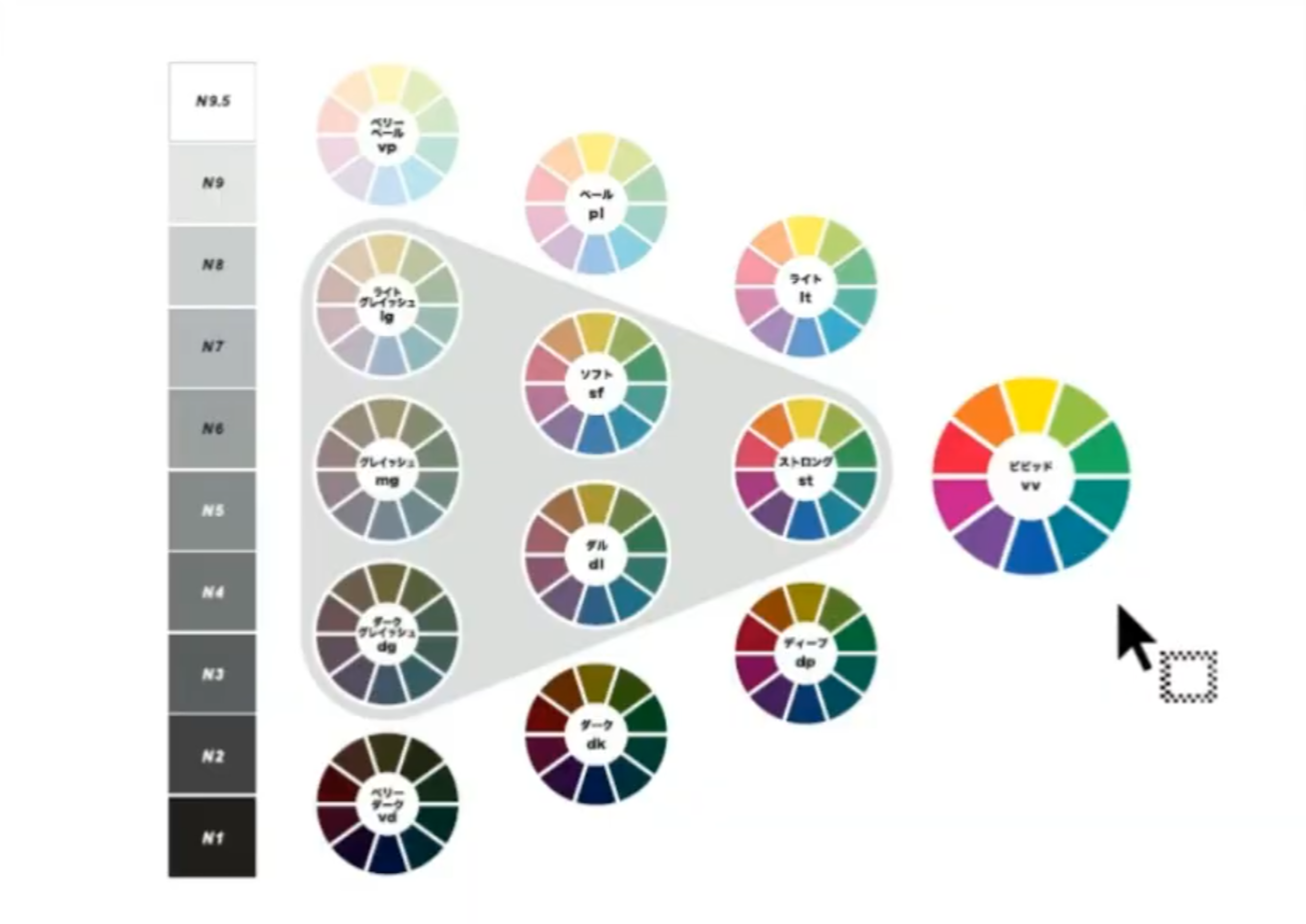 スライドでトーンの表を紹介し、明るい色(ライト、ペール)、暗い色(ディープ、ダーク)、ビビッドトーン、地味な色の分布を説明。例えば「子ども向け世界観」にはビビッドやペールトーン、和風にはディープやソフトトーンが適しており、その他にも「疾走感」を出すにはコントラストの強い色を組み合わせを使う手法があることや、新緑の黄緑に赤系や青紫系を加えるとインパクトが生まれると解説しました。