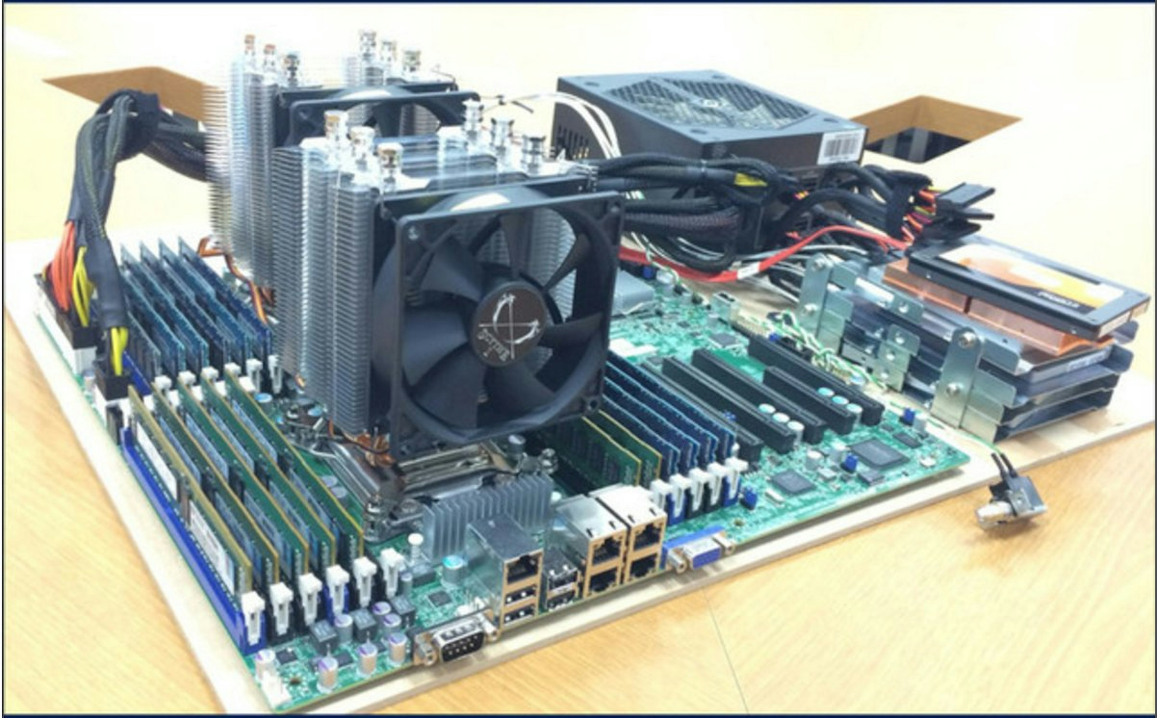 これは、ベニヤ板の上にパソコンの部品を並べて作った手作りサーバーです。膨大なデータをさばくにあたり多数のサーバーを入れ替えしやすくするため、また当時は資金が少なかったこともあり、このような工夫をしていたとのことでした。