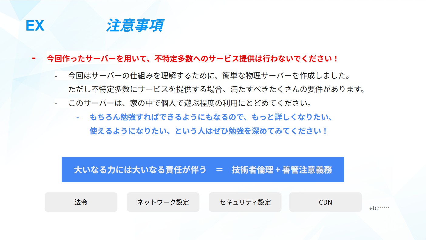 多くの情報が溢れる現代のインターネットには、悪意や危険も多く存在しています。利用者を守りながらサーバーを公開するためには、セキュリティ対策、法律への対応等、さらなる学びが必要です。