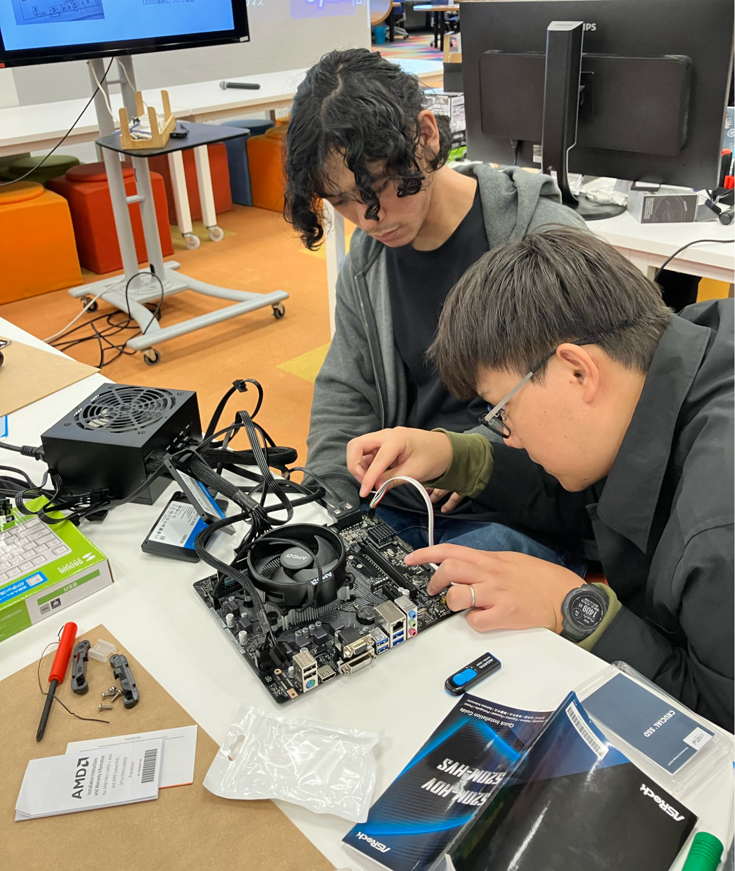学生たちはグループに分かれて、実際にサーバーを組み立てました。CPU、メモリ、マザーボードなどの部品を一つずつ取り付けていく作業は、まるでプラモデルを作るような感覚です。