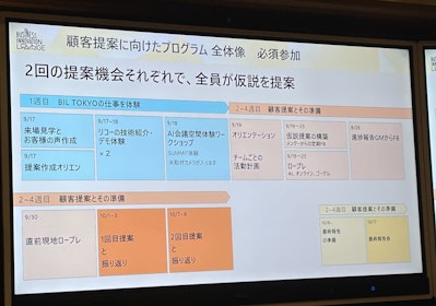 このBIL TOKYOは、リコーの強みである自然言語AIや画像認識AIといった最新技術を活用しながら、企業や自治体といったお客様と共創し課題解決を行うための対話の場所です。このプログラムでは、チームで仮説を立てお客様に提案する、まさに実践の場でした。