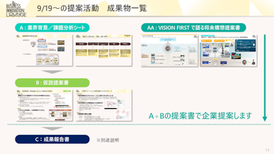 まず提案に向けた準備から始まります。事前にリコーの営業の方との打ち合わせを実施し、提案内容のテーマを共有しました。その後、AIを使ったディープリサーチを通じて情報を集め、お客様の課題解決に向けた仮説を立てて提案資料にまとめます。