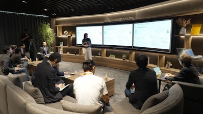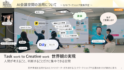 提案に向けて、その考え方や手法を見つけるため、ワークショップが開催されました。ワークショップルームは、AIが支援する会議空間になっていて、部屋に組み込まれたマイクがディスカッションの発言を拾い、AI音声認識エンジンによって、テキスト化します。テキスト化された発話をDify[※1]があらかじめ組まれたワークフローにそって加工し、Miro[※2]に転送することで、議論の土台を生成してくれるのです。これによって、発言内容を付箋に短文要約することで議事録を簡単に生成することもできるのです。